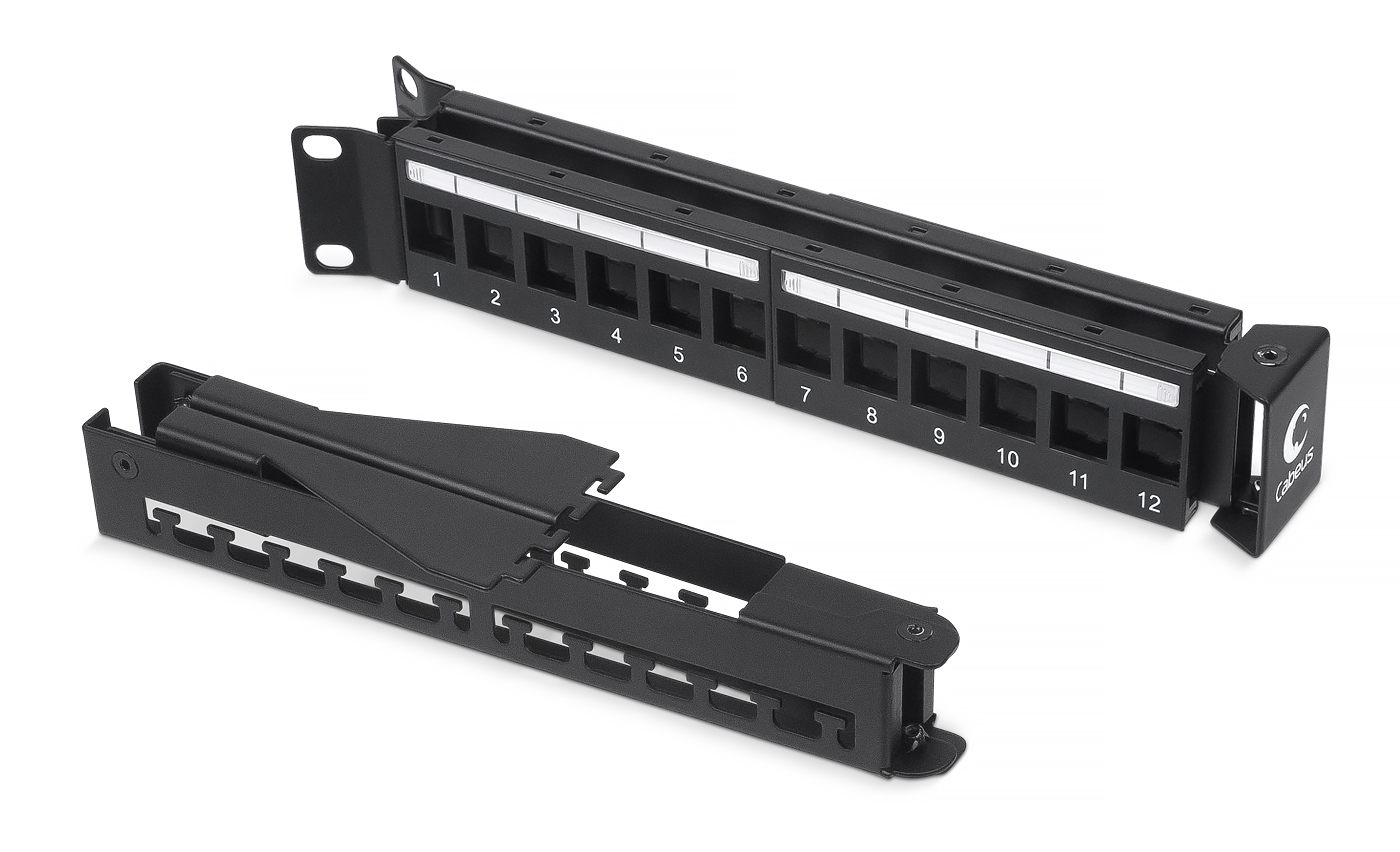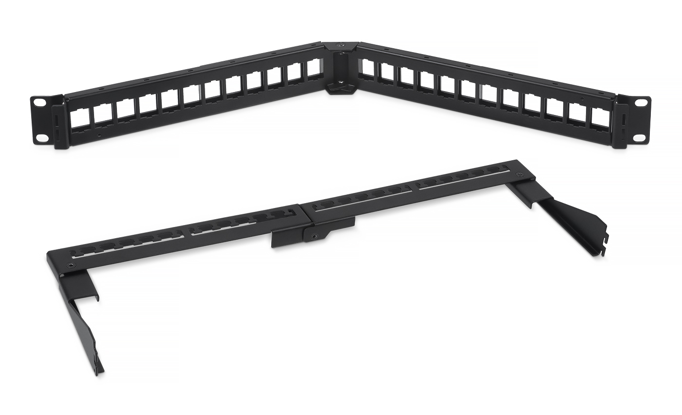 Модульная угловая патч-панель Cabeus выполнена в 19” формате и предназначена для установки в телекоммуникационные шкафы и стойки.